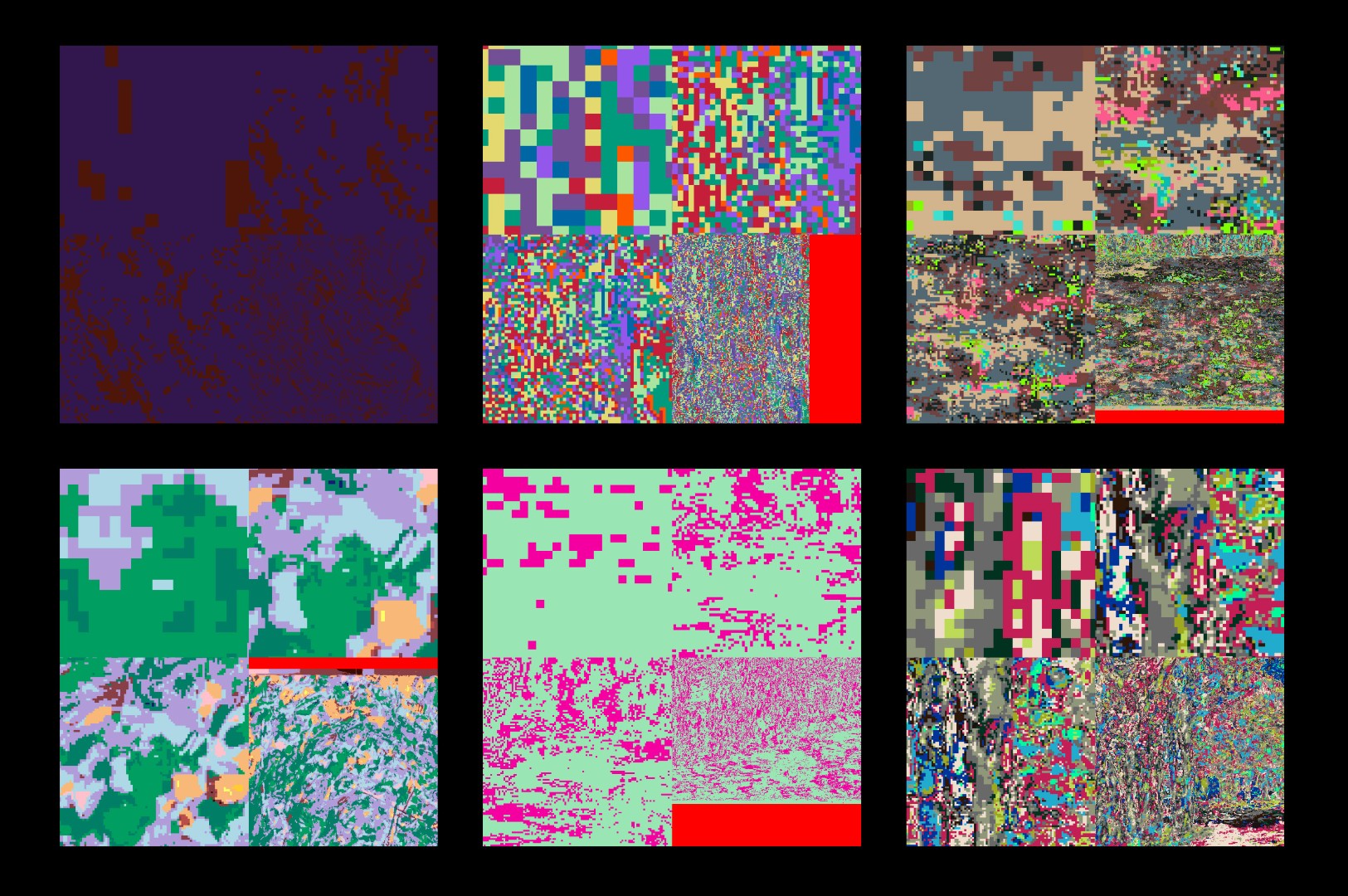 the following are directional fft filtered, binaried, dilated and then k-means segmented images cropped and scaled up.