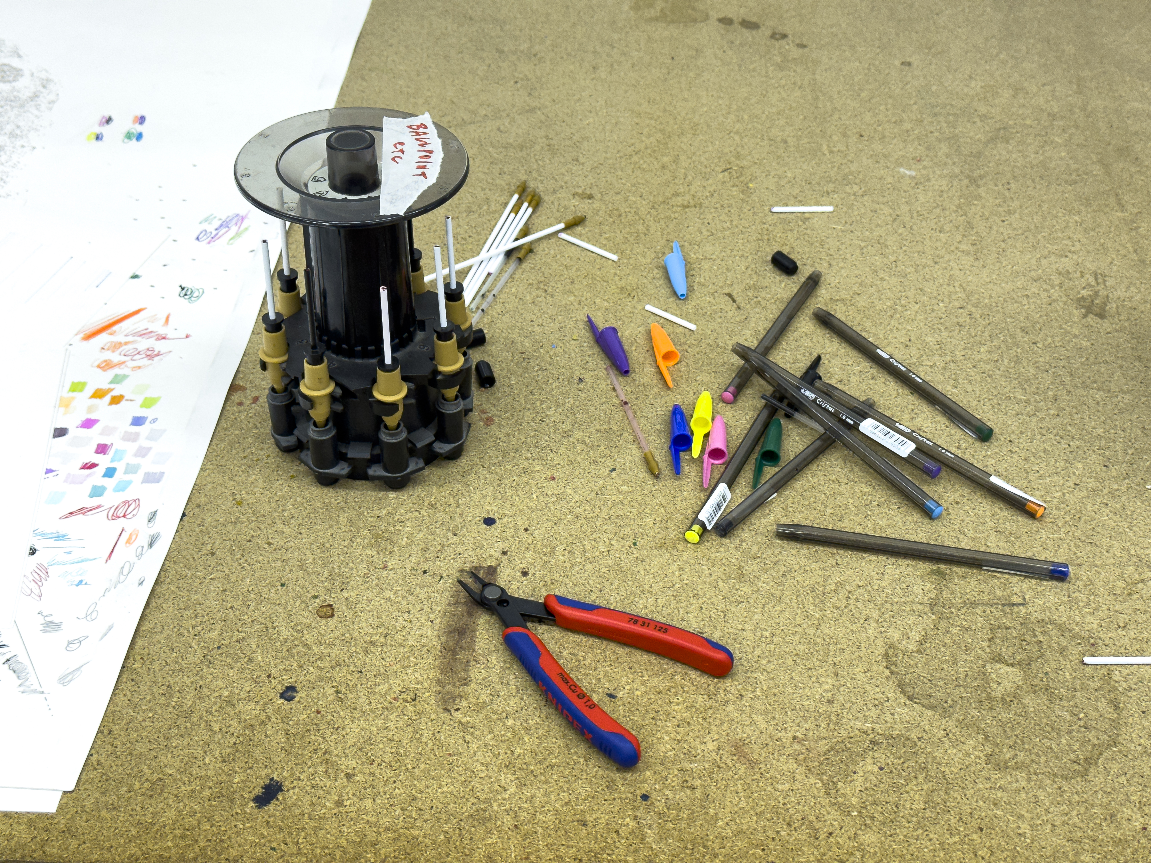 Alcohol-based copic inks (in recycled bodies of 80s plotter pens)