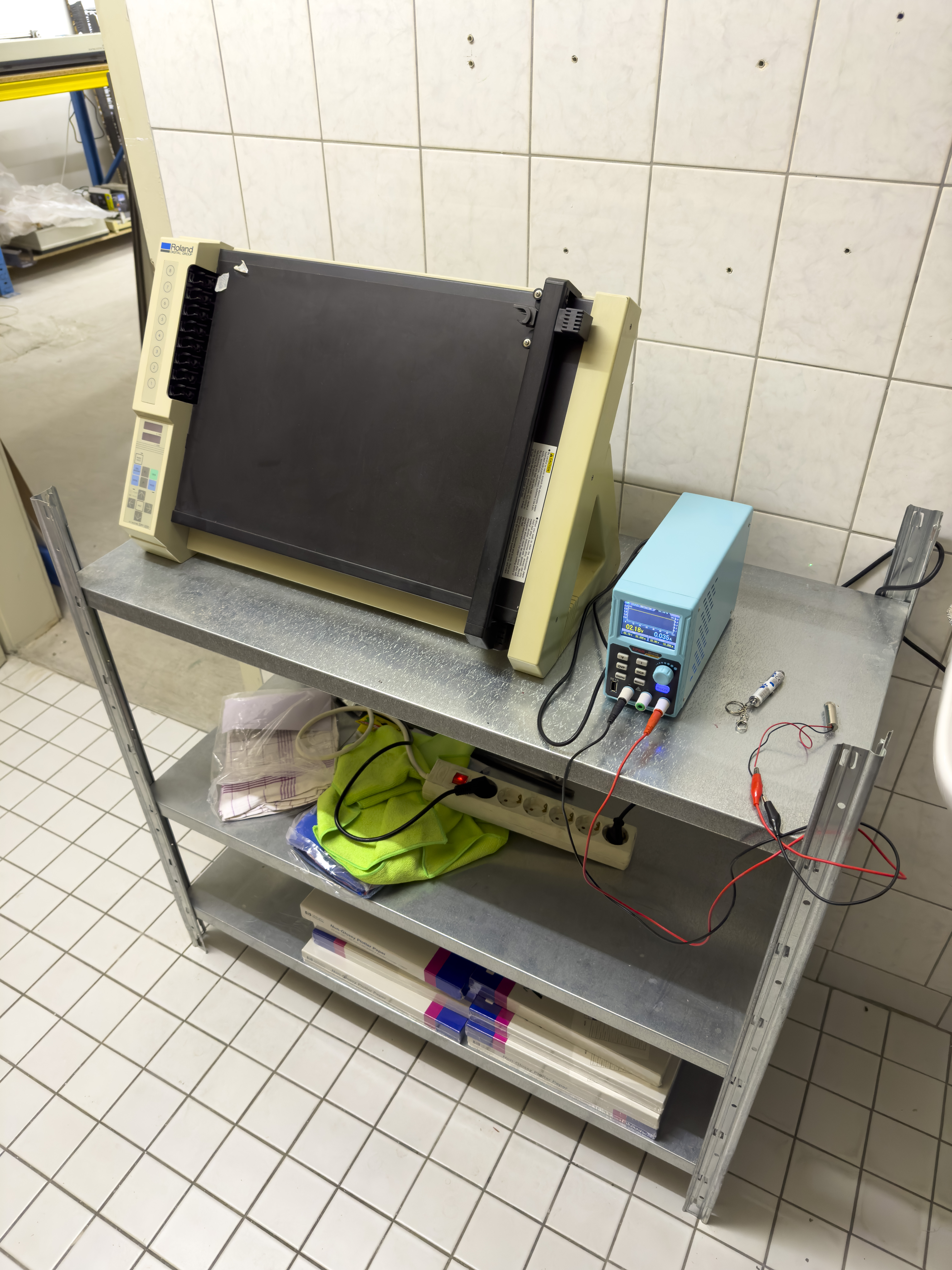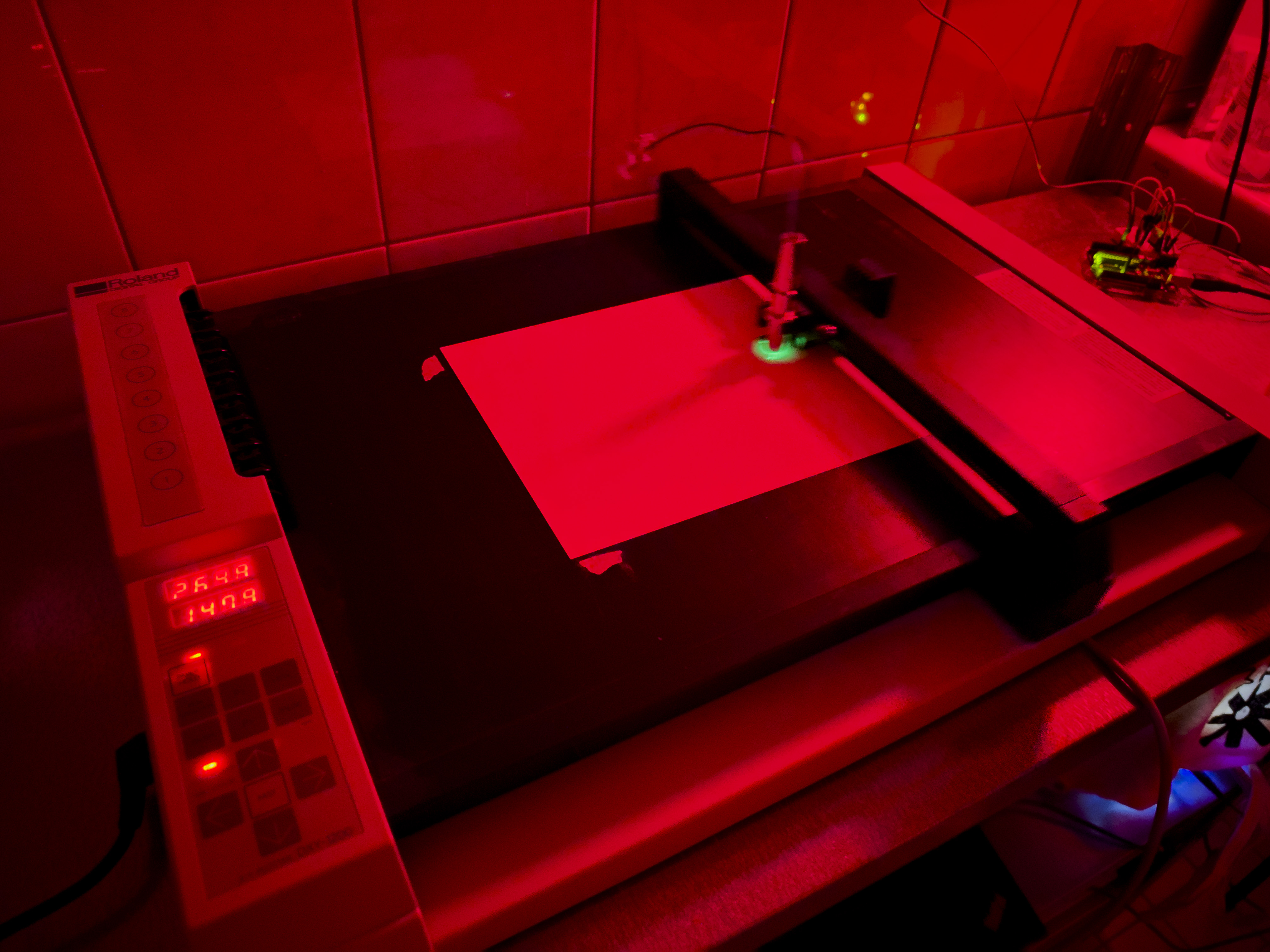 The setup: A vintage Roland DG DXY-1200 plotter & a lab PSU for variable voltages