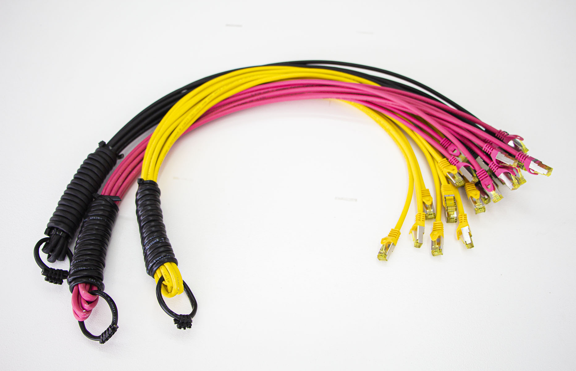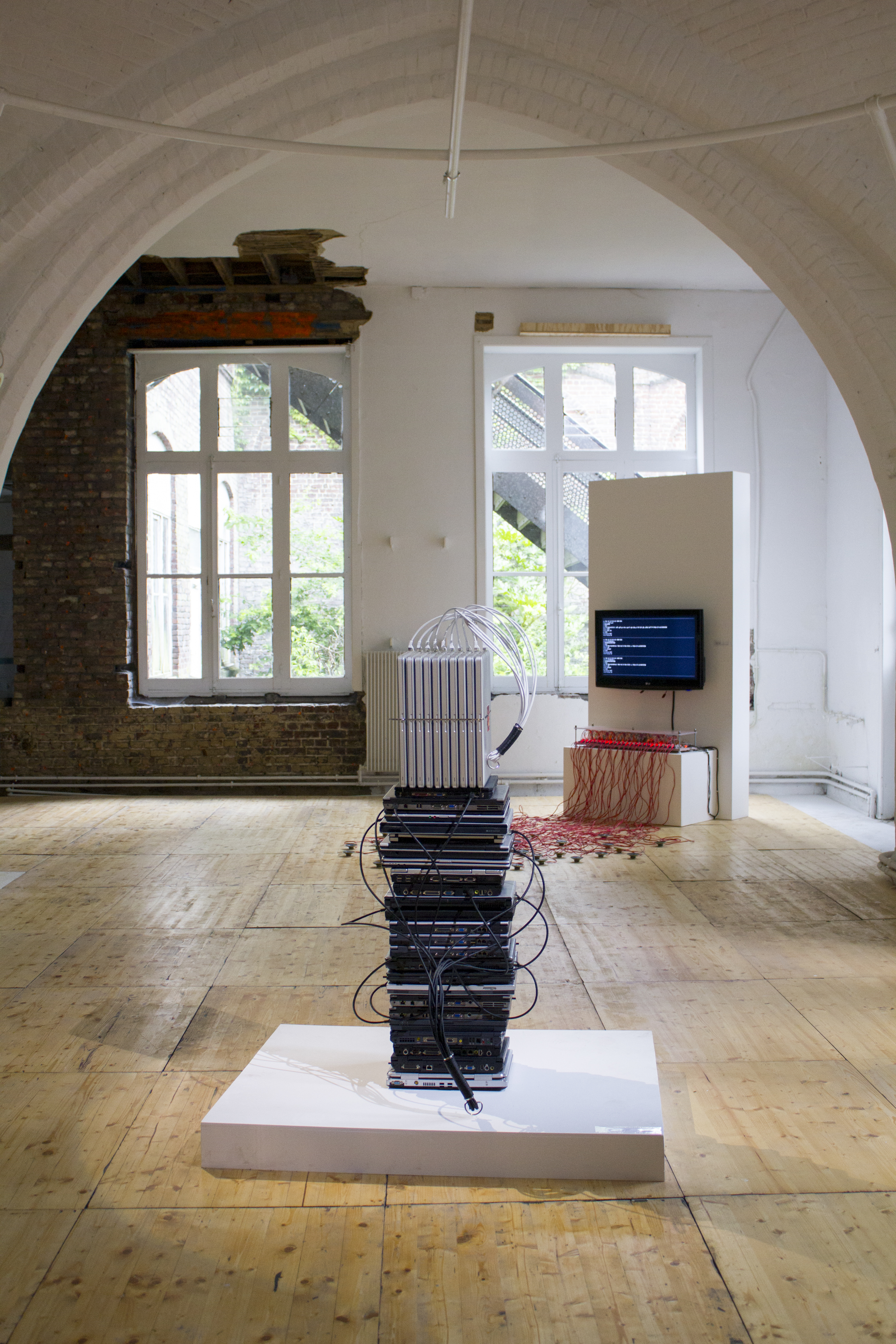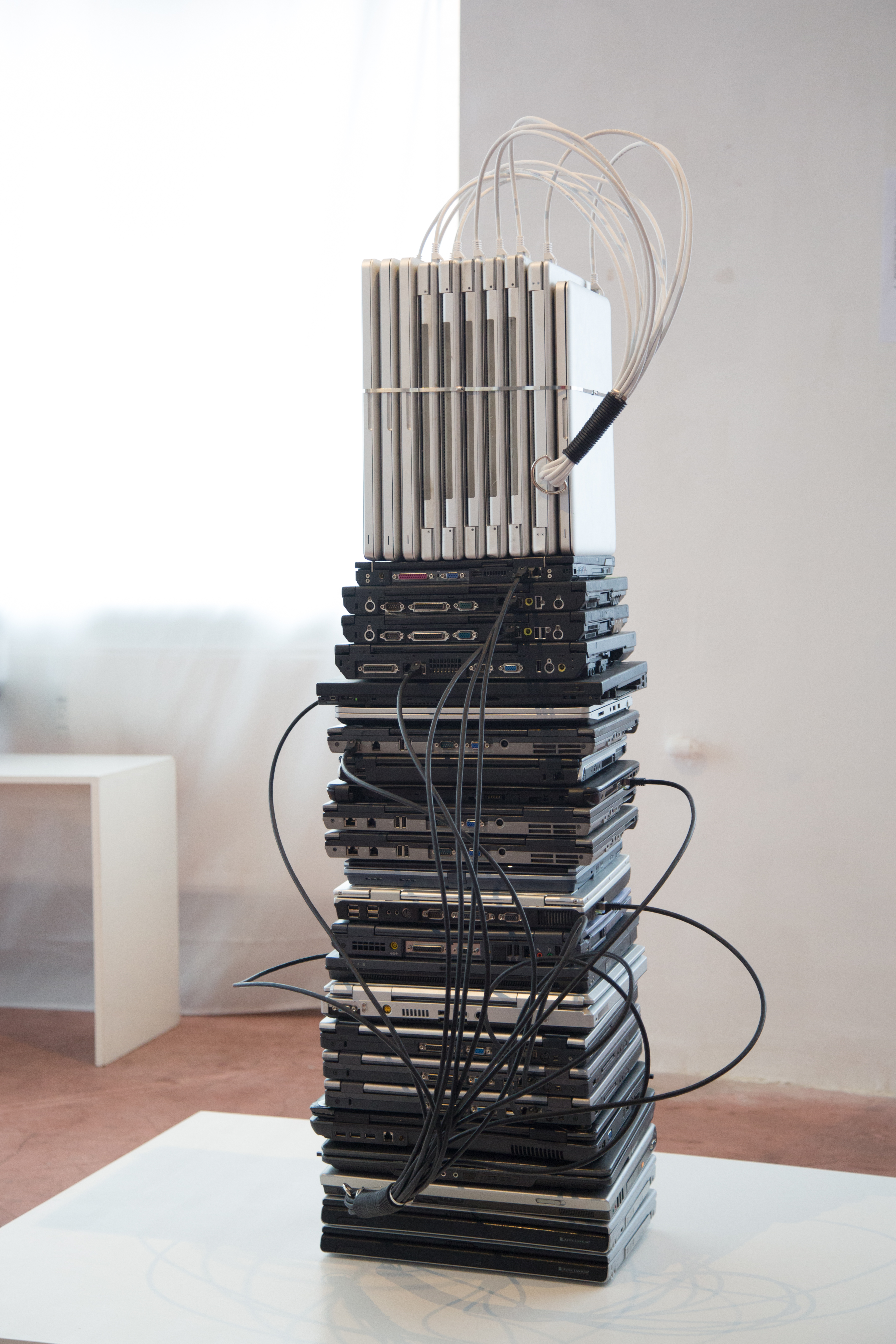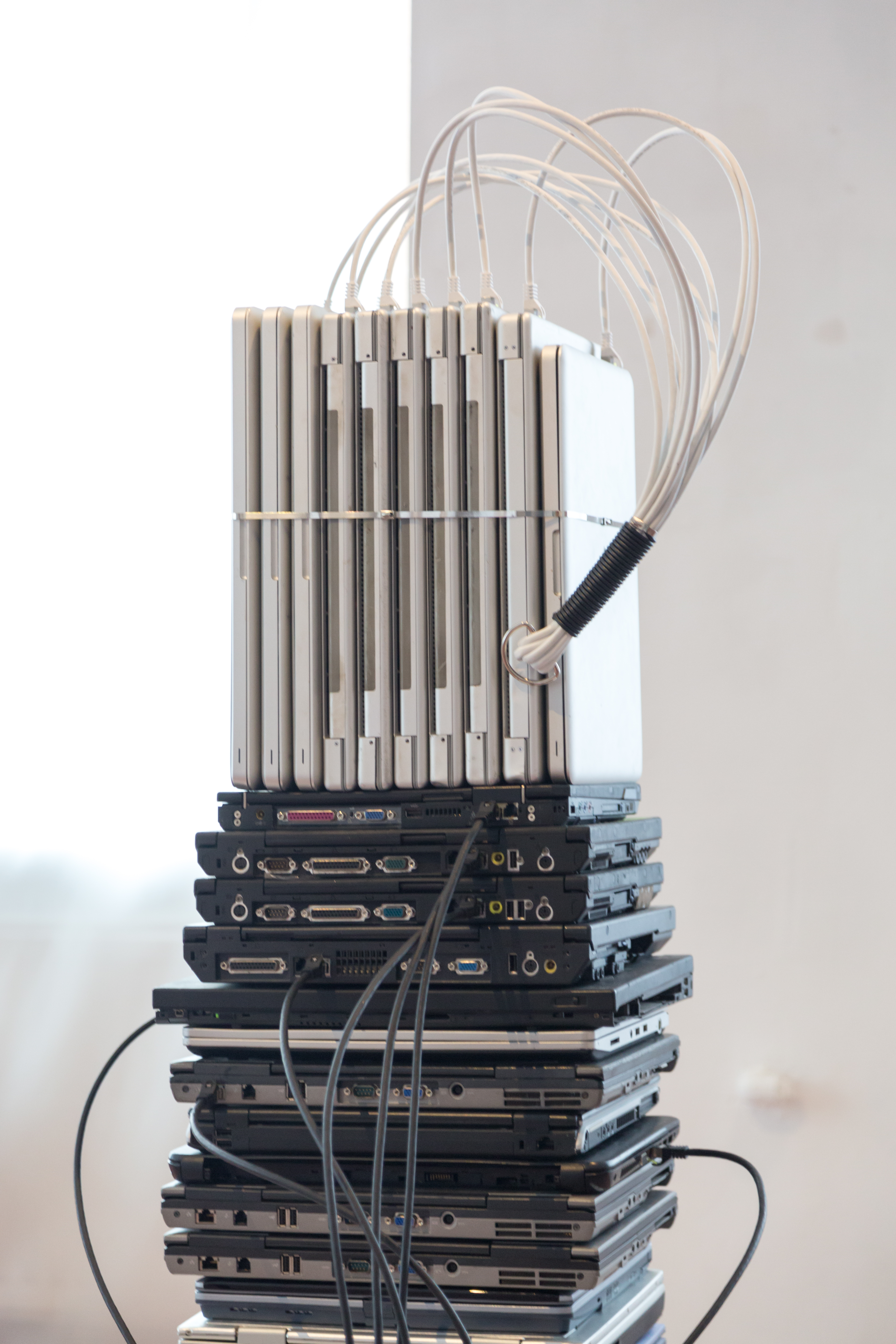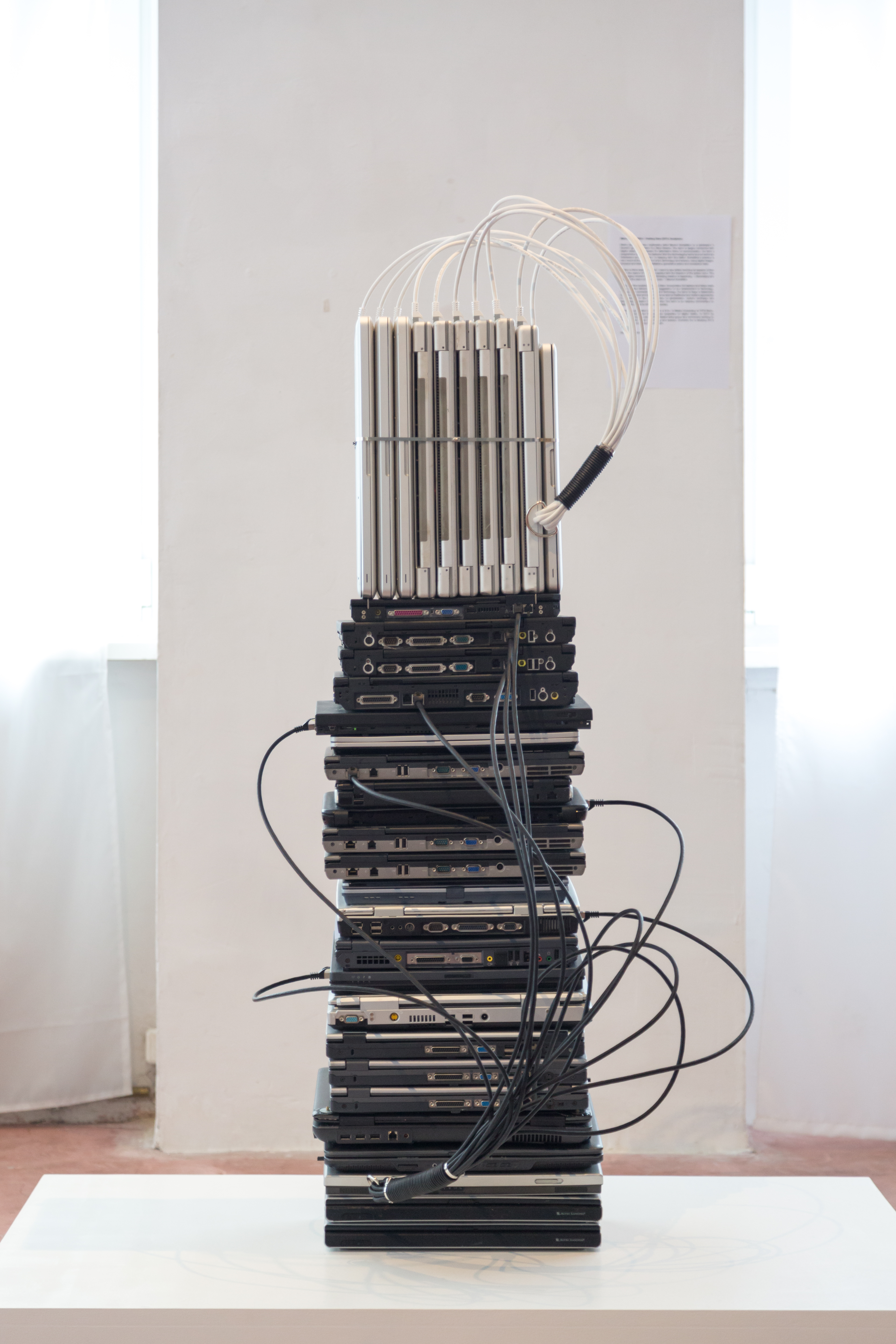 A tower of 34 laptops stacked up and tied together. Including two lashes made of ethernet cables connected to various RJ45 plugs. (120 x 100 x 150cm)