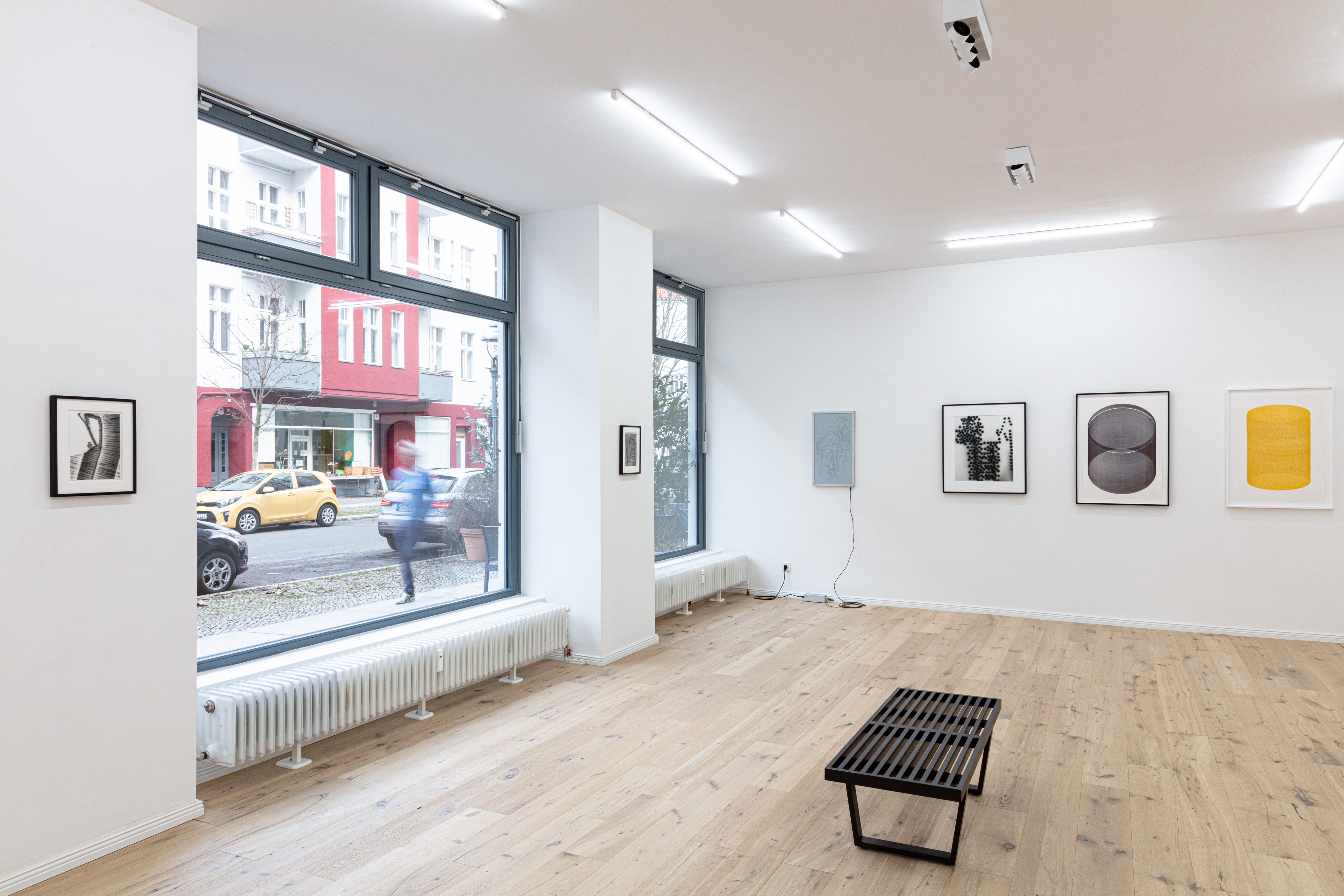 Marcel Schwittlick: Das ist ein Industrie-Wachsstift, der eher für Straßenmarkierungen gedacht ist. Die Eigenschaften sind hervorragend – er funktioniert bei minus 40 bis plus 60 Grad, auf rostigem Metall, auf nassem Gummi, auf öligem Stahl. Bevor ich mit Plottern zu arbeiten begann, habe ich digital oder mit Skulpturen, Malerei gearbeitet, und immer sehr reduziert – vielleicht inspiriert von den alten Pionieren oder weil es mir um Struktur geht. Zeichenmaschinen waren dann das, was am meisten Sinn machte, um Arbeiten aus dem Computer herauszubekommen. Für mich hat es keinen Sinn gemacht, Sachen auszudrucken, also keine Pixel-Grafiken von Vektoren zu erzeugen. Ich habe eine große Maschine gebaut und mich auf alte Plotter aus den 70er und 80er Jahren spezialisiert, die wundervolle Maschinen sind. Damals war die Ingenieurwissenschaft auf einem ganz anderen Level als heute. Ich habe angefangen, diese Maschinen zu sammeln und sie so zu benutzen, wie vor 40-50 Jahren. Man kann sie einfach an Computer anschließen, und als ausgebildeter Informatiker ist es simpel, mit den alten Maschinen zu arbeiten. Man braucht keine Treiber, man macht alles selbst. Mittlerweile habe ich etwa 50-60 Plotter in unterschiedlichen Größen. Bei jeder Serie geht es mir auch um die Materialität. Auf der einen Seite steht der digitale, algorithmische Prozess mit vielen Zufällen. Im zweiten Schritt kommt dann eine materielle Ebene dazu, die für das ästhetische, finale Produkt wichtig ist. Das hier zum Beispiel ist eine Fotografie – ein direktes Positiv, in der Dunkelkammer entwickelt, keine Kopie. Eine Lichtquelle wird darüber gesetzt, belichtet und entwickelt. Die anderen sind mit dicken Wachsstiften gemacht. Es bereitet mir viel Freude, aus den unterschiedlichen Medien das Besondere herauszukitzeln. Bei der Spirale im Flur, die mit Kugelschreiber gemacht ist, sind es ganz viele extrem nahe Linien. Diese alten Maschinen geben mir Kontrolle über die Andruckstärke und Geschwindigkeit, sodass ich ganz genau den "Sweet Spot" finden kann, wo das Material gut funktioniert. Filzstifte erfordern andere Geschwindigkeiten als Bleistifte oder Wachs. Die Tiere hier sind mit original 80er-Jahre Stiften gemacht – wasserbasierten Tinten in kleinen Kartuschen, die damals produziert wurden und die man in die Plotter einbauen kann. Ich habe viele Autofahrten durch Deutschland gemacht, um Plotter abzuholen, und dabei auch alte Stifte bekommen – mal eine Handvoll ausgetrocknete, mal funktionierende. Bei Filzstiften ist es so, dass sie leer gehen, vor allem, wenn sie 40 Jahre alt sind. Der Prozess bei den Tierzeichnungen ist, dass sie von außen nach innen gezeichnet wurden, immer im Kreis. Beim Hahn sieht man es am besten – es fängt außen an und geht nach innen, und während der Zeichnung wird der Stift leer, wodurch dieser Verlauf entsteht. Da ich seit vielen Jahren mit Maschinen zeichne, finde ich das absolut faszinierend. Flächen mit Linien auszufüllen geht auf viele verschiedene Arten, aber solche Verläufe, besonders beim Hahn, habe ich noch nie irgendwo gesehen.