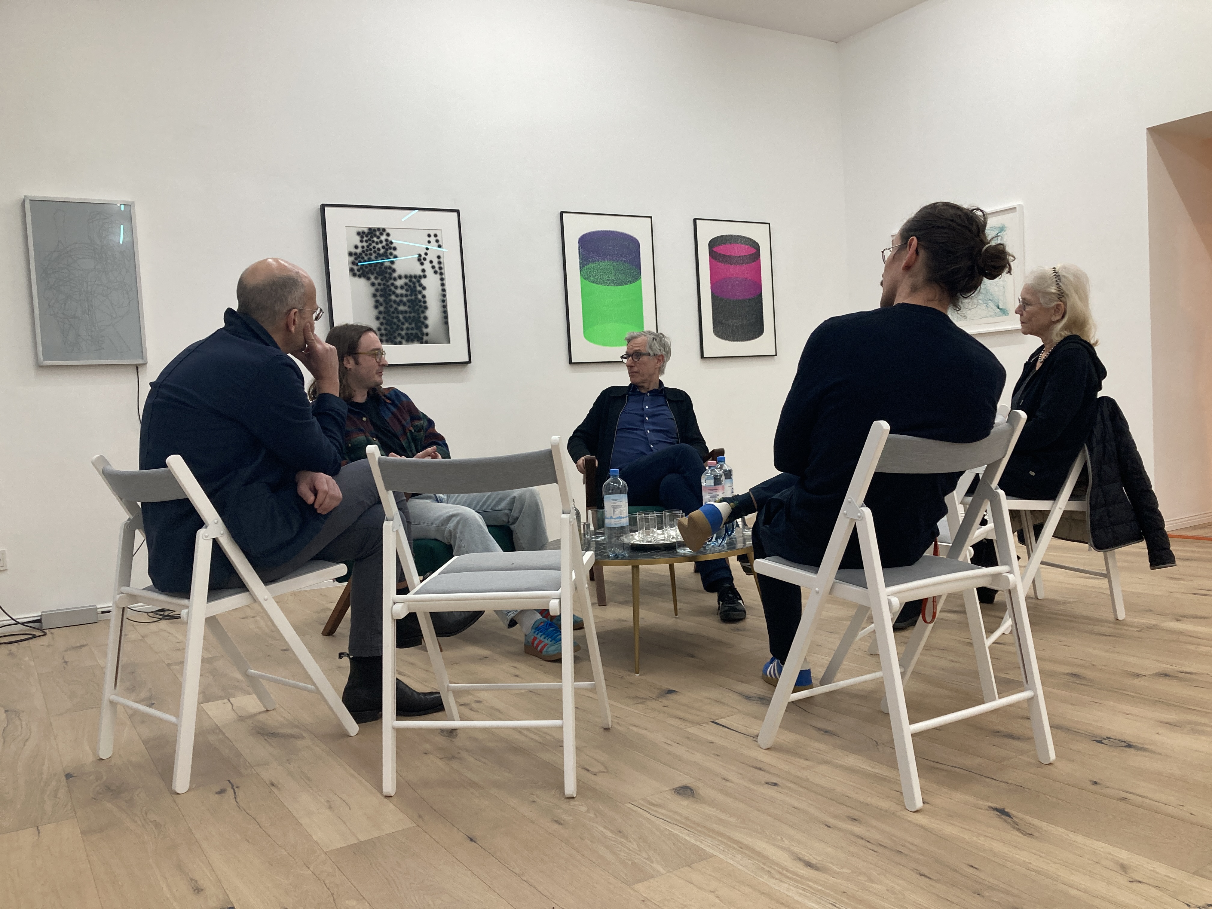 Wolf Lieser: You know all the pioneers, and you've already met some of them here. If we look at the beginnings of computer art in the 60s and 70s, almost without exception, these were people who programmed. They had to learn programming, or they found someone to work with them—as some artists did, who had someone write the program based on their concept. But this programming approach, this concept as the foundation of art—these were really the beginnings, which is not at all a requirement nowadays. But we won't delve into that because it's a separate topic, today is about you. Looking at the early pioneers, certain systems were defined. For instance, some squares that should stand in certain dimensions, that should overlap. There were certain variables in the representation. That was all part of the program. And so certain drawings emerged, to put it very simply. Of course, this became more complex over time. But that's not your approach, as I learned yesterday; you work completely differently. That's why our topic today is the process. How do you work when, for example—let's take those two drawings back there, which have to do with cursor movements. But the final image doesn't exist as a goal for you. Can you tell us a bit about how this comes about, what fascinates you about it, and why you choose this path?